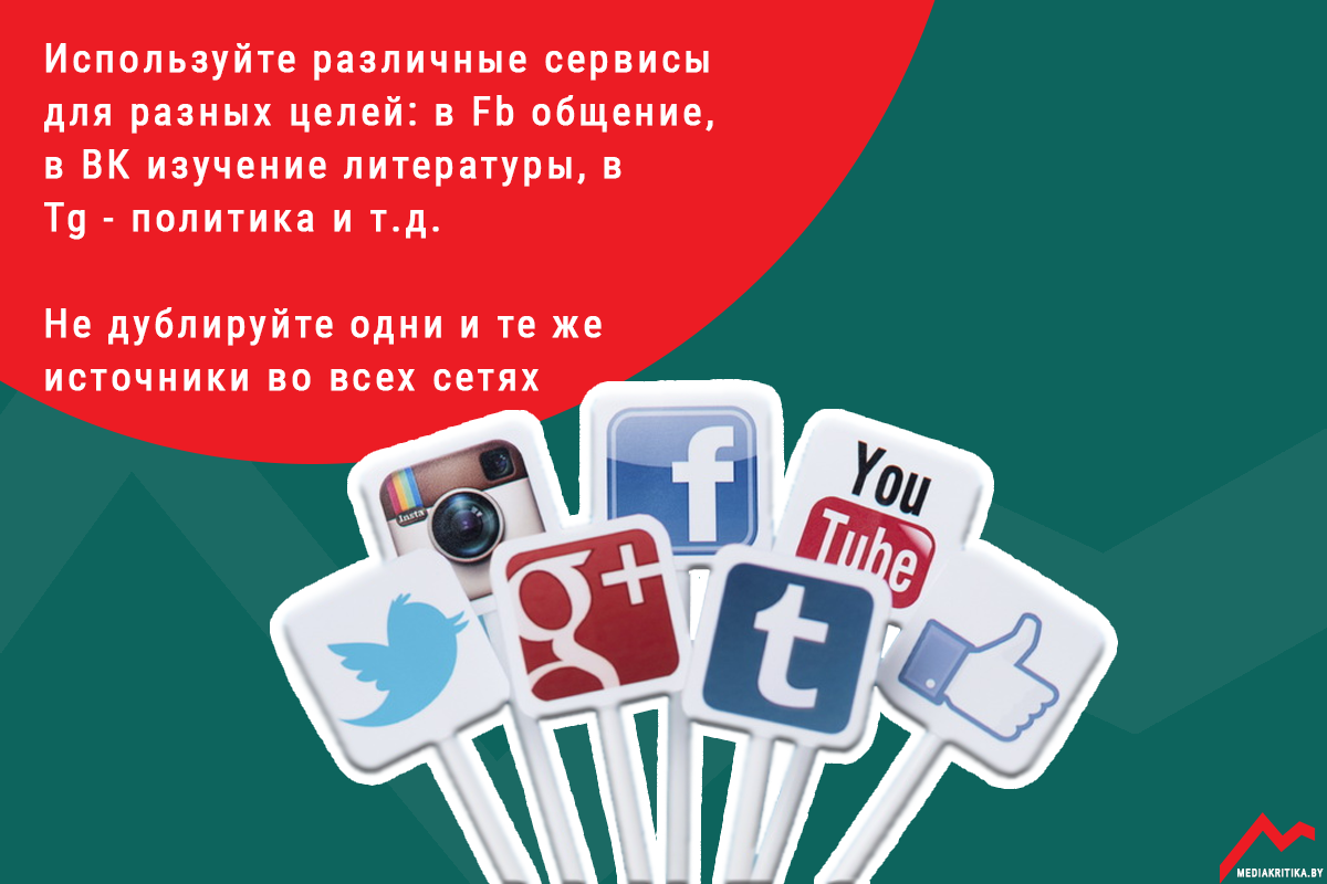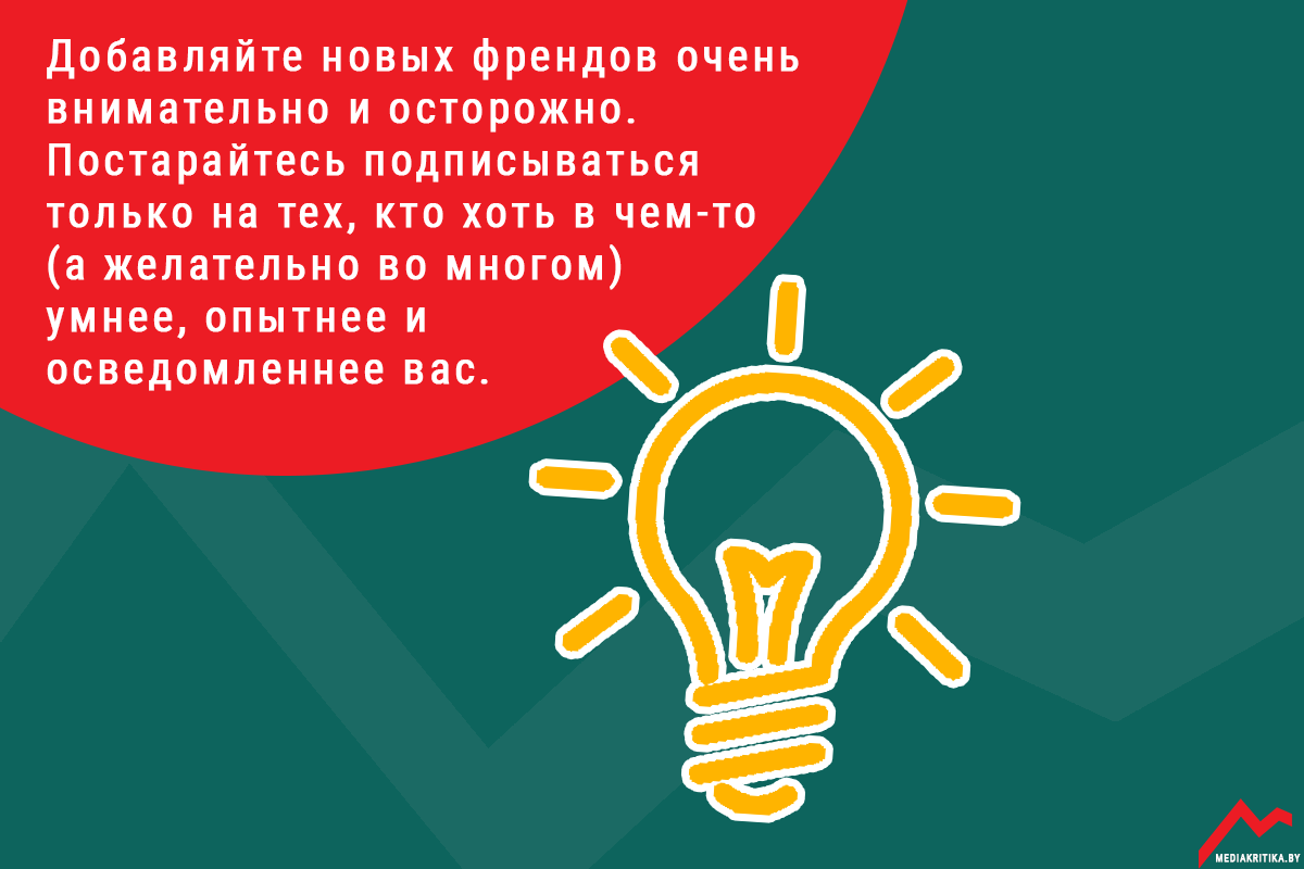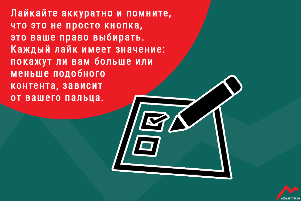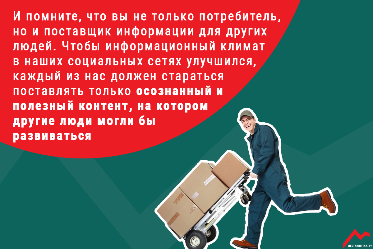 Mediakritika.by дает советы по цифровой гигиене в картинках. Их можно сохранять на память, пересылать друзьям и знакомым, делиться в социальных сетях. И помнить, что если мы сами не возьмем контроль за своим поведением в соцсетях, за нас это сделает искусственный интеллект и алгоритмы, придуманные другими.