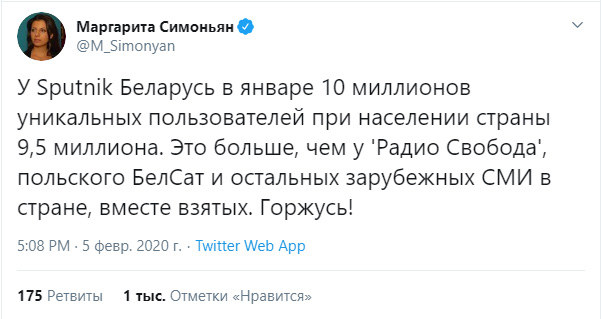 «У Sputnik Беларусь в январе 10 миллионов уникальных пользователей при населении страны 9,5 миллиона. Это больше, чем у 'Радио Свобода', польского БелСат и остальных зарубежных СМИ в стране, вместе взятых. Горжусь!» - пишет Маргарита Симоньян, главный редактор канала Russia Today, информационных агентств «Россия сегодня» и «Спутник».