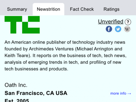 Заявляется, что новый инструмент будет сводить воедино авторитетность источника, пометки о сатирическом содержимом или кликбейте, а также данные о проверке фактов.