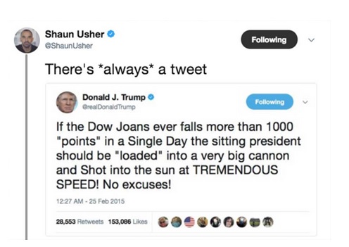 В феврале 2018 года один из пользователей Twitter «напомнил» остальным, что Дональд Трамп еще до своего президентства якобы писал, что если Dow Jones упадет за день больше чем на 1000 пунктов, текущего президента надо затолкать в пушку и выстрелить в солнце.