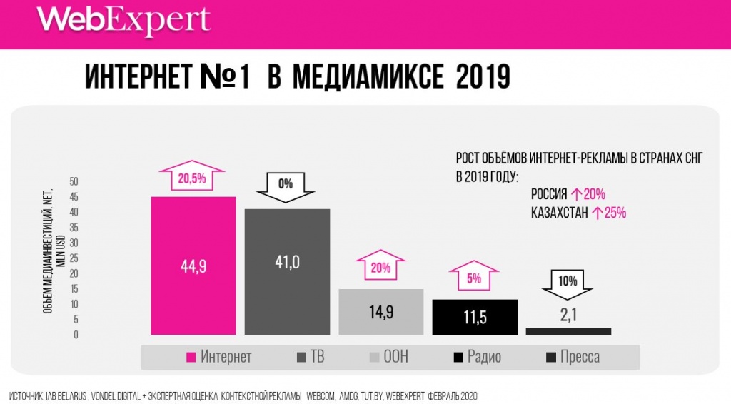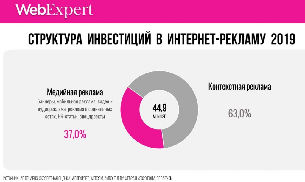 Согласно оценкам Ассоциации интерактивной рекламы и ведущих беларуских сейлс-хаузов, объем медиаинвестиций в интернет, как канал рекламы, составил 44,9 млн. долларов, против 41 млн. долларов, вложенных рекламодателями в продвижение на ТВ, пишет Marketing.by.
