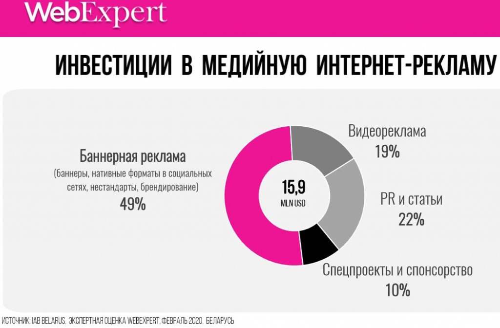 В рамках медийной рекламы основные инвестиции были вложены в Беларуси в 2019 году в баннерную рекламу. На втором месте - PR и статьи.
