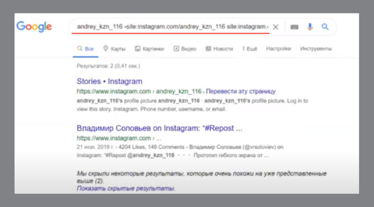 - Поиск аккаунта по фамилии и имени, а также более детализированный поиск по публикациям в Instagram, удобнее осуществлять через Google. Например, если нужно найти все комментарии человека под чужими постами, в строке поиска нужно задать имя (название аккаунта), исключить упоминания на его личной странице, но оставить все остальные упоминания на сайте instagram.com (см операторы поиска выше).