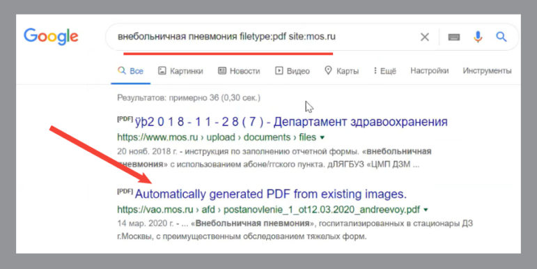 - Сочетайте разные операторы поиска. Например, чтобы найти словосочетание в PDF-файлах на сайте мэрии Москвы, задаем в строке поиска запрос: внебольничная пневмония filetype:pdf site:mos.ru