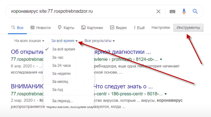 - Уточняйте период поиска. Для этого нужно нажать «Инструменты» и выбрать необходимый временной промежуток в выпадающем списке.