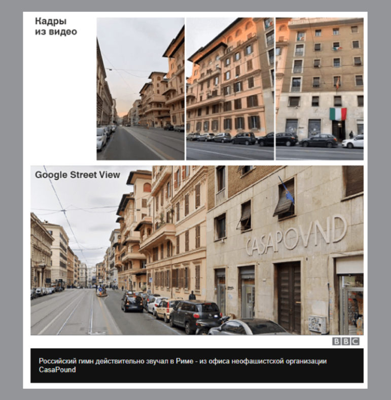 Таким образом Русская служба Би-би-си выяснила, что здание, в котором играет российский гимн – это центральный офис неофашистской организации CasaPound («Дом Паунда») в Риме. Члены этой организации ездили в Крым после аннексии, регулярно посещают Москву и восхищаются действующим режимом.