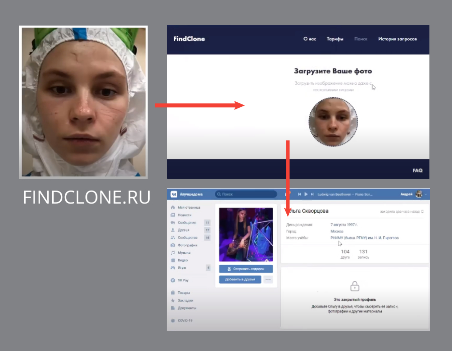 С помощью сервиса Findclone мы нашли профиль этой женщины-врача в соцсети ВКонтакте; он закрыт, но ей можно написать или попытаться установить ее связи с помощью инструментов, о которых мы поговорим далее.