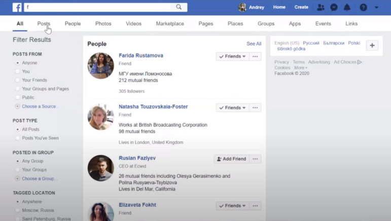 Встроенный поиск в этой социальной сети работает плохо, хотя, если использовать англоязычную версию Facebook, то в ней есть возможность искать информацию не только по профилям, но и по фотографиям, группам, постам и комментариям.