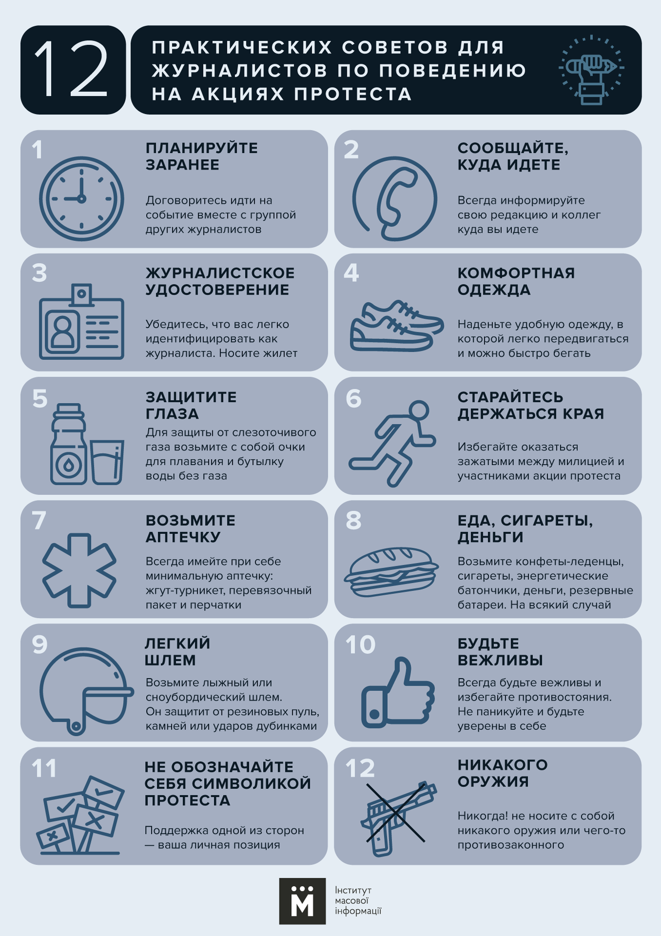 Наши украинские коллеги из Института массовой коммуникации щедро поделились с нами практическими советами, которые помогали журналистам работать на Майдане.