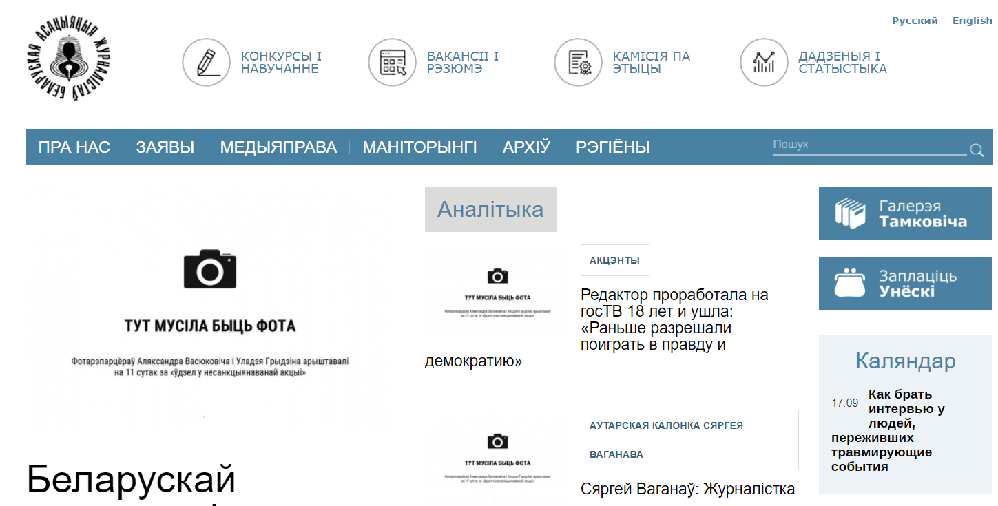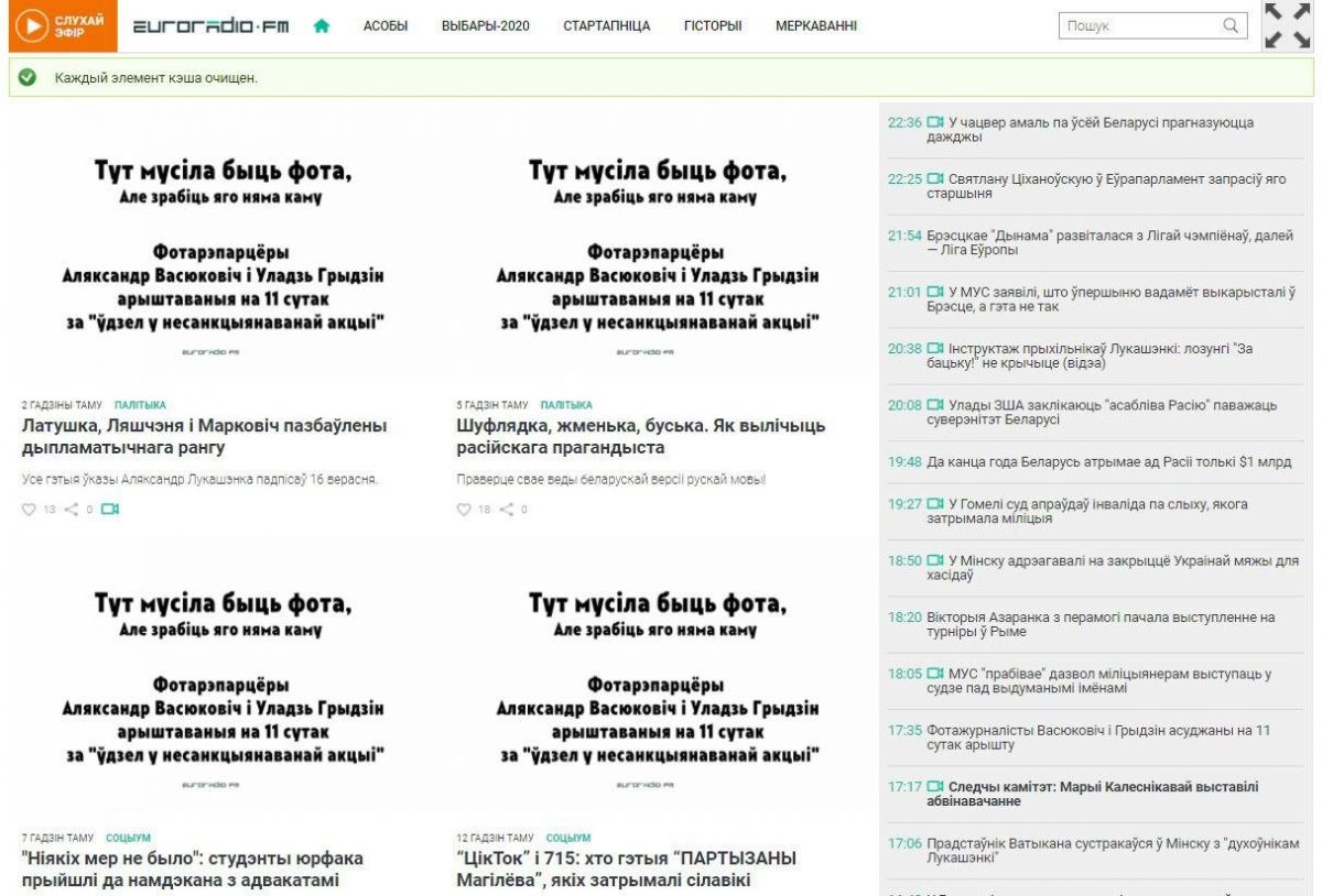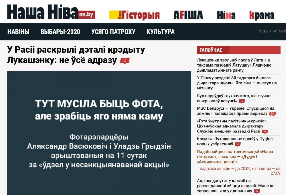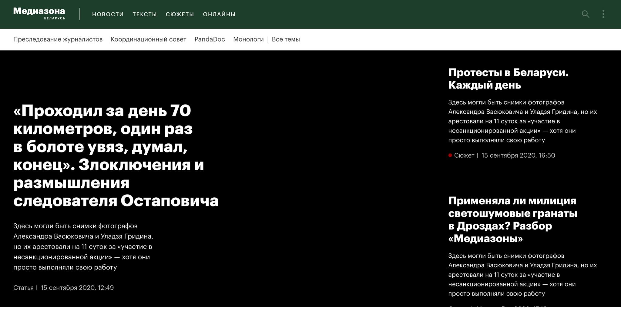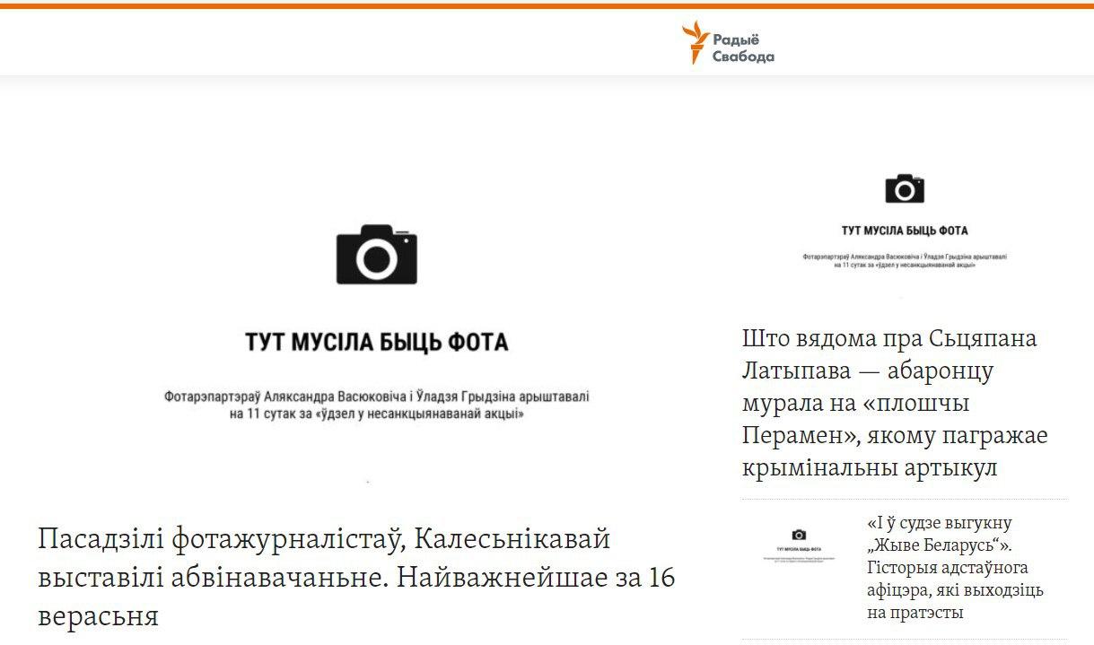 В четверг, 17 сентября, большинство крупных независимых медиа Беларуси, отказались от использования фото на главных страницах своих изданий в знак поддержки фотожурналистов Уладзя Гридина, Александра Васюковича и Марины Дробышевской, которые получили по 10-11 суток административного ареста за якобы "участие в несакнционированном мероприятии".