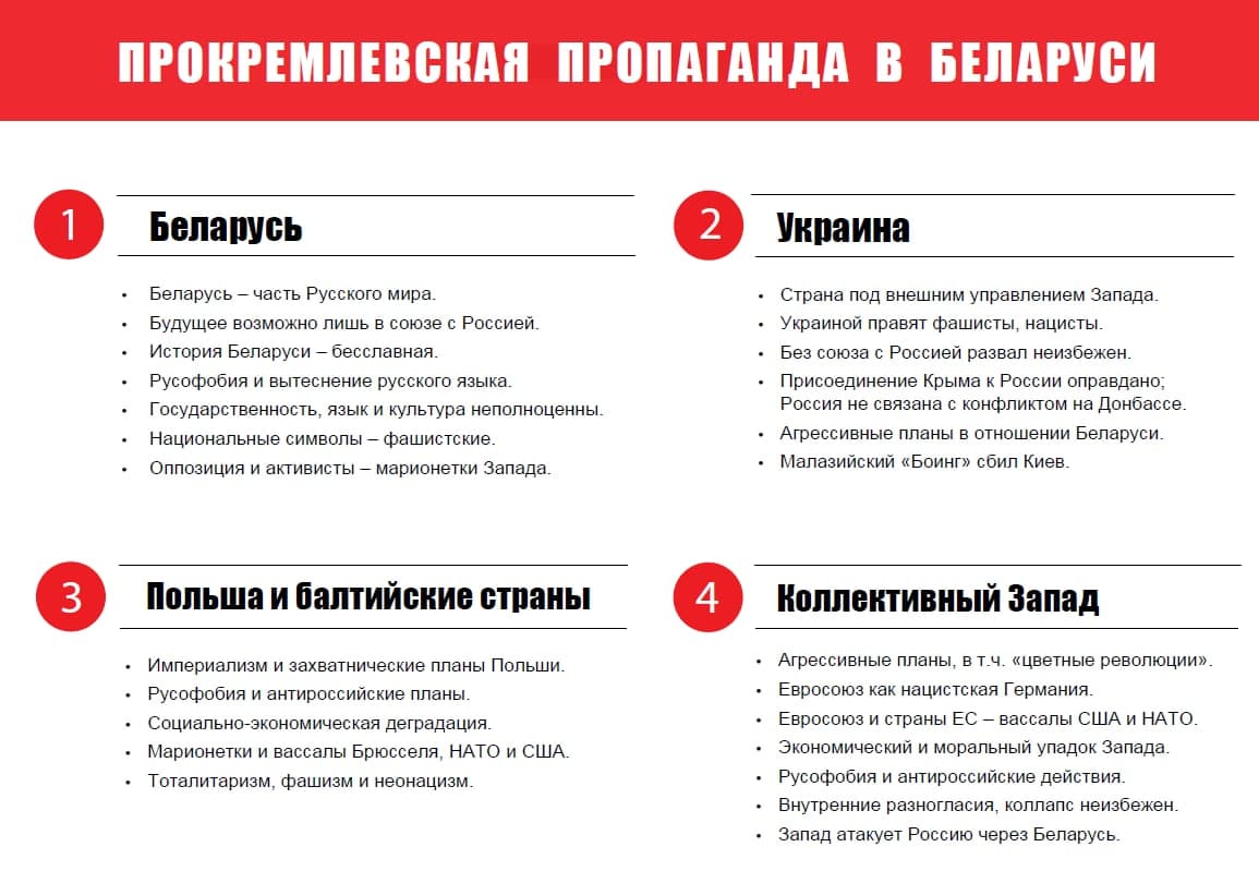 Двадцать пять нарративов, которые служат основой практически всему комплексу прокремлевской пропаганды в Беларуси, можно распределить в четыре группы исходя из объекта повествования: по Беларуси, Украине, Польше и балтийским странам, и коллективному Западу в целом.