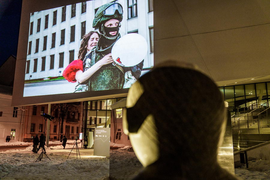 Пандемия коронавируса внесла коррективы в организацию экспозиции: фотографии демонстрируются не в выставочном зале, а снаружи, на стене музея МО в центре Вильнюса.