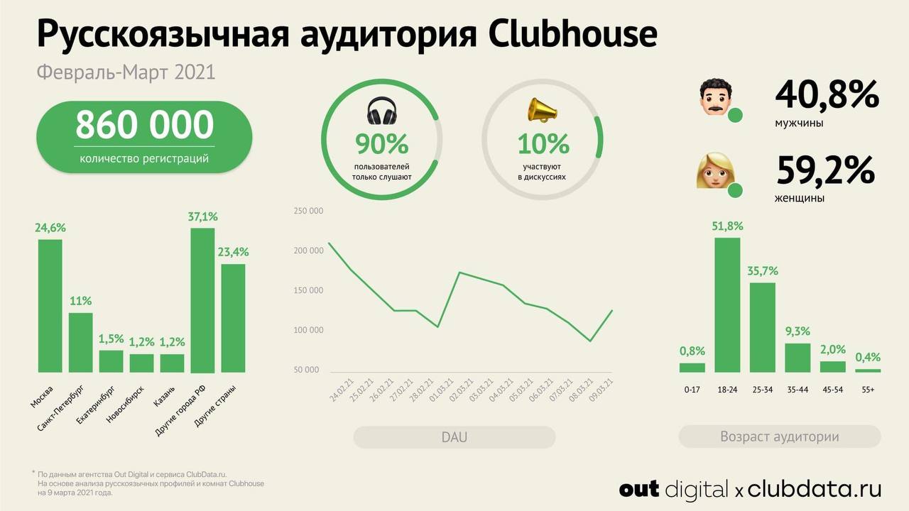 Мы отследили, что в конце первой недели февраля регистрации в сервисе начали расти, к середине месяца достигли максимальных показателей — на пике (16-19 февраля) в сервисе регистрировалось по 70-90 тысяч русскоязычных пользователей в день. К концу февраля показатели снизились, а в начале марта в Clubhouse регистрировались менее чем по 10 тысяч русскоязычных пользователей в день. Всего по состоянию на 12 марта у Clubhouse, по оценке ClubData, порядка 900 тысяч русскоязычных пользователей.