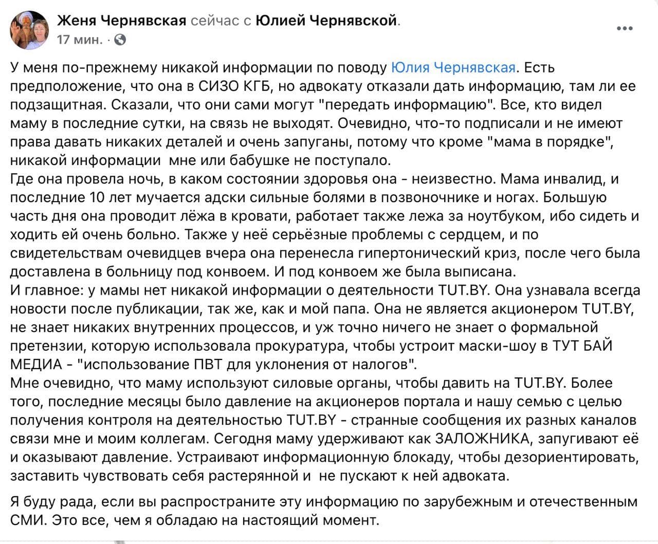 «Мне очевидно, что маму используют силовые органы, чтобы давить на TUT.BY. Более того, последние месяцы было давление на акционеров портала и нашу семью с целью получения контроля на деятельностью TUT.BY - странные сообщения их разных каналов связи мне и моим коллегам. Сегодня маму удерживают как ЗАЛОЖНИКА, запугивают её и оказывают давление. Устраивают информационную блокаду, чтобы дезориентировать, заставить чувствовать себя растерянной и не пускают к ней адвоката».