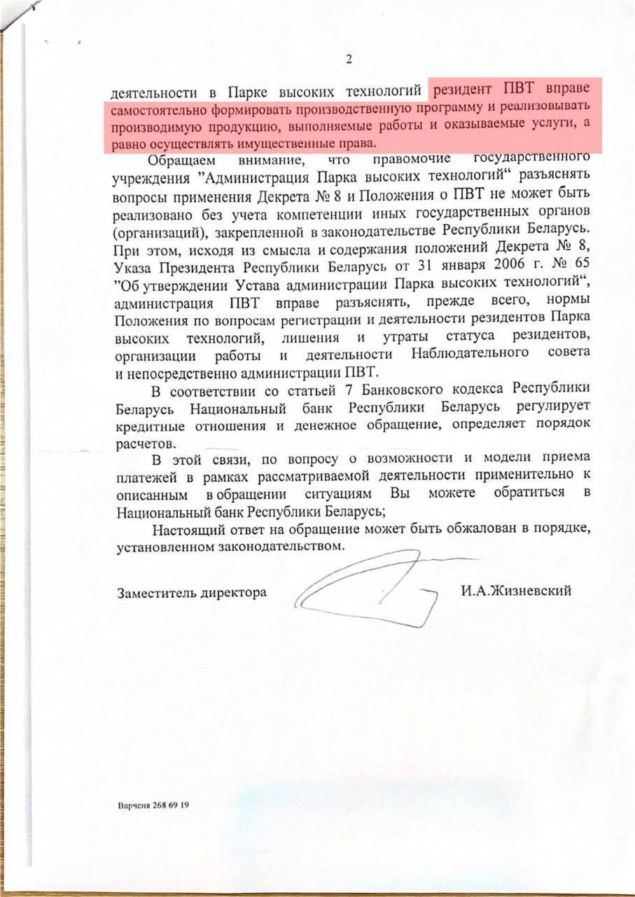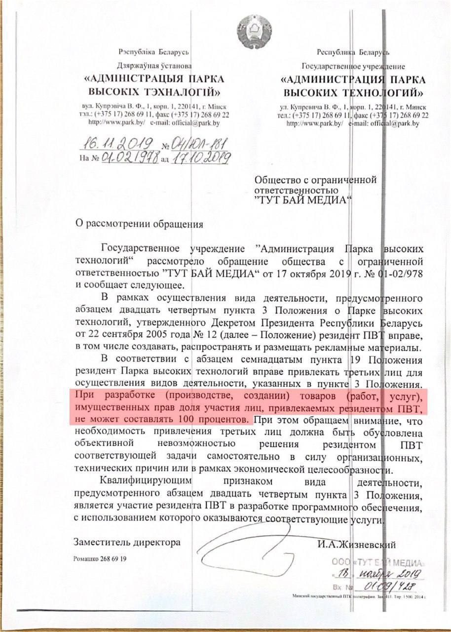Это официальное письмо Администрации Парка высоких технологий, которое было направлено в адрес «ТУТ БАЙ МЕДИА». Из него следует, что резиденты сами определяют, что разрабатывать, и что процент разработки может быть даже 1%. Четкое определение, что такое ПО или разработка, в документе также не прописано.