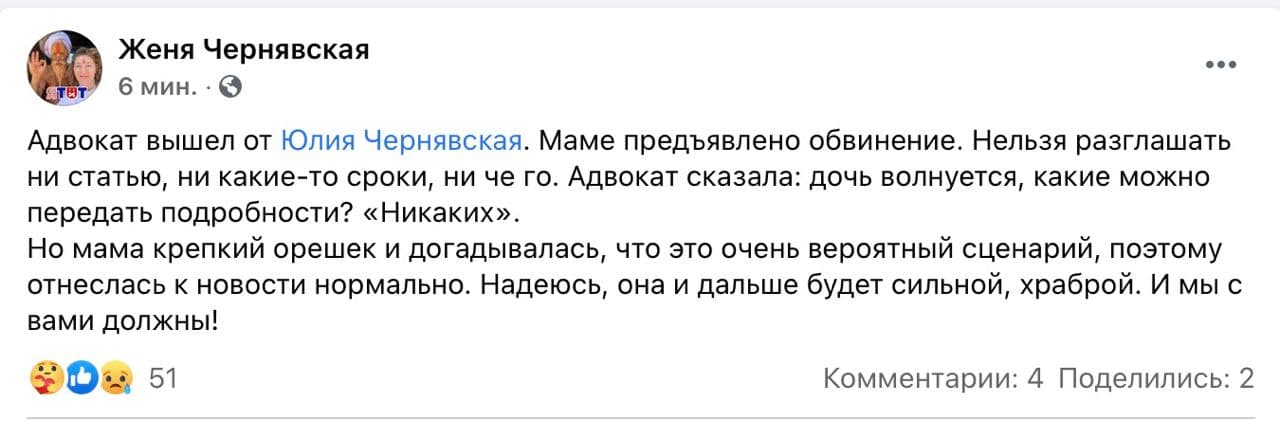Связи с Чернявской не было около трех суток, позже стало известно, что она находится под домашним арестом.