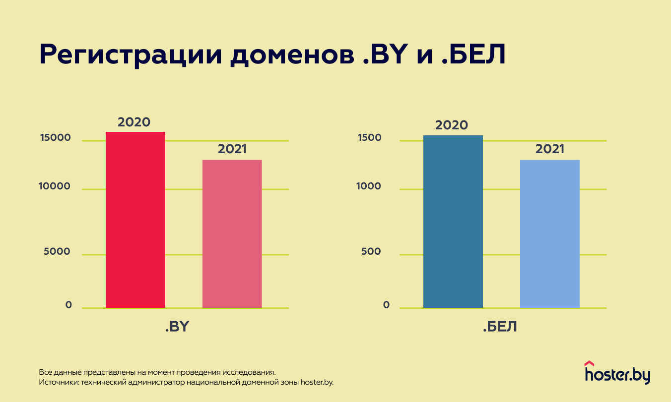 За первую половину 2021 года в зонах .BY и .БЕЛ зарегистрировано 14,540 доменов, или около 87 имен в сутки. Это на 20% меньше, чем за аналогичный период 2020-го. Удаленных доменов за тот же период также стало почти на 3000 меньше. Однако в целом картина довольно удручающая — количество новых регистраций практически сравнялось с количеством удалений. В прошлом году прирост новых имен составлял 0,9%, в этом году — символический плюс в 91 домен (0,06%).