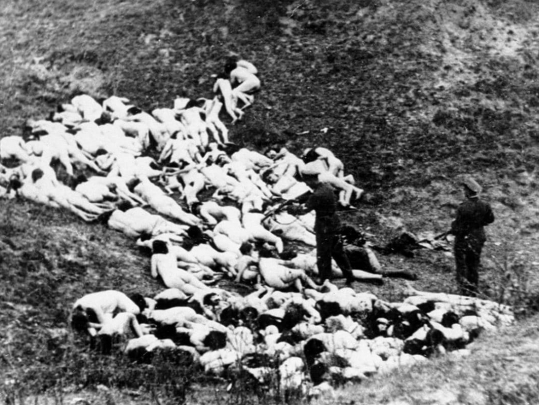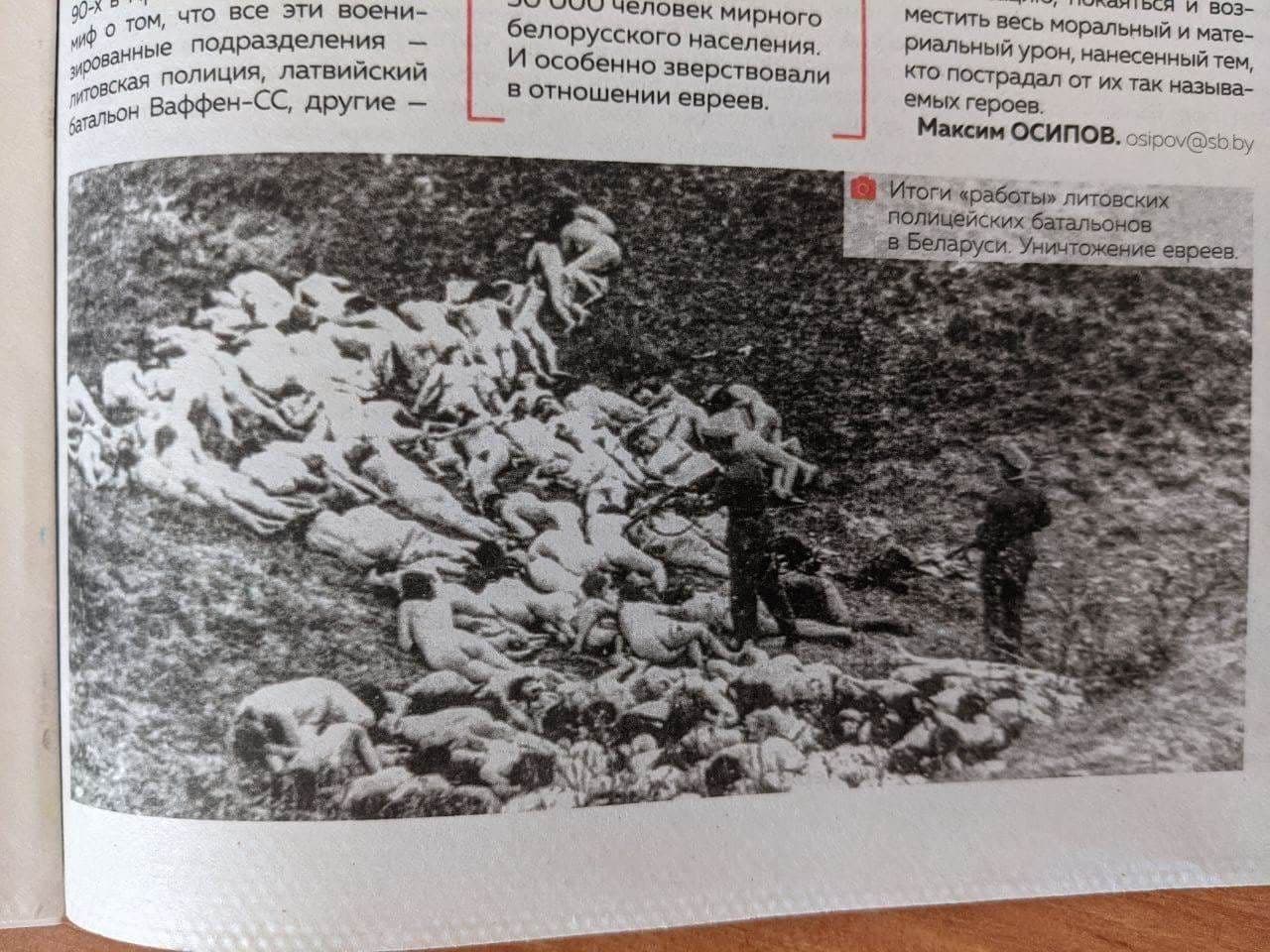 Он проиллюстрирован фото с подписью «Итоги "работы" литовских полицейских батальонов в Беларуси. Уничтожение евреев».
