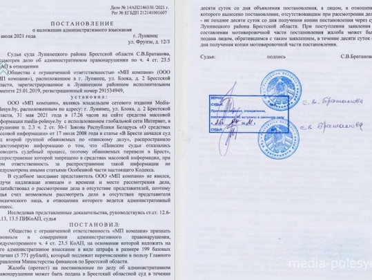 Суд оштрафовал «Медиа-Полесье» на 199 базовых величин