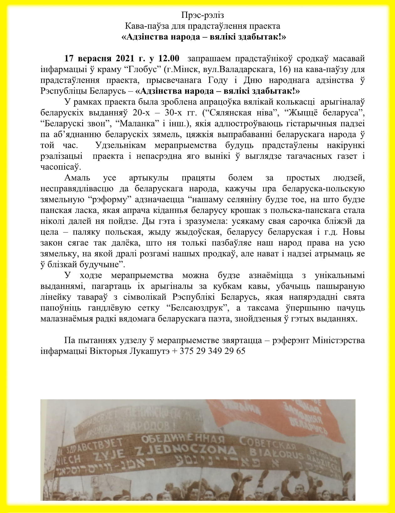 «И на ней журналистам решено рассказать про нелегкую борьбу за объединение нации сто лет назад, «боль за простых людзей, несправядлівасць да беларускага народа» и селян, которых угнетали, по версии министерства, и поляки, и евреи – словом, все подряд, - сообщает редакция издания, которое находится под блокировкой Мининформа, и чьи журналисты и редакторы были вынуждены покинуть страну.