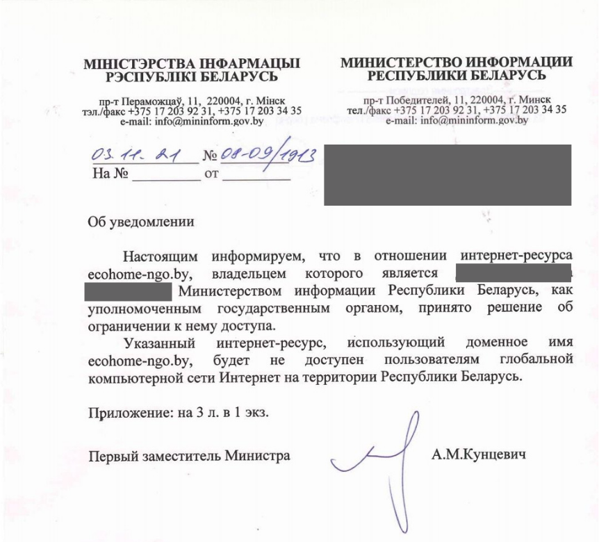 Накануне, экологическое НГО "Экодом", лишенное юридического статуса властями Беларуси, получило письмо с предупреждением о блокировке сайта.
