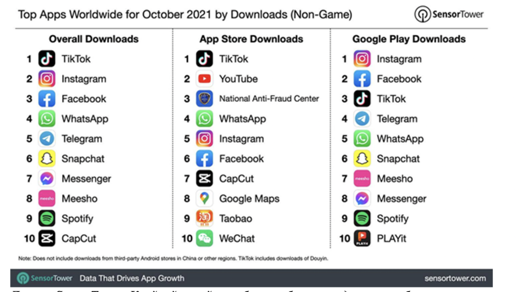 По данным компании Sensor Tower, приложение TikTok занимает первое место в мире по популярности среди неигровых сервисов; за все время своего существования оно было скачано из Apple Store и Google Play более 3 миллиардов раз.