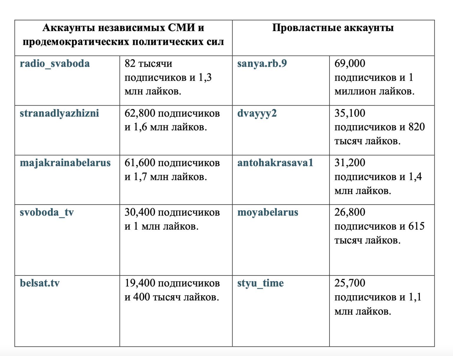 Для сравнения, самый популярный хэштег сторонников демократического движения – #жывебеларусь – набрал более 777 миллионов просмотров. Это в три раза больше самого популярного хэштега провластных TikTok-аккаунтов. Ряд прочих хэштегов сторонников перемен также заметно популярнее: #бчб (315 млн просмотров), #тихановская (249 млн), #лукашенкоуходи2020 (130 млн), #странадляжизни (229 млн), #ямы97 (90 млн).