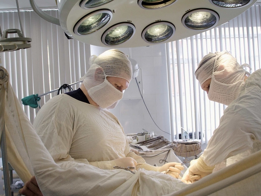 Едем дальше: опять потолок, двери и – стоп! Одна из сестер жмет на кнопки кодового замка, дверь открывается – мы в операционной. Собственно, это такой предбанник, где за переборкой завершается предыдущая операция. Сразу в уши вонзается пронзительный звук: з-з-з-з-з…Это сверло вгрызается в кость. Деловитый женский голос комментирует: