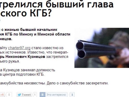Весть о том, что начальник УГБ по Минску и Минской области Игорь Кузнецов застрелился из охотничьего ружья облетела медиа за считанные минуты. Все началось, как обычно, с той самой «Хартии», которой информацию о "самоубийстве" сорока на хвосте принесла (а точнее, некий неназванный источник сообщил).