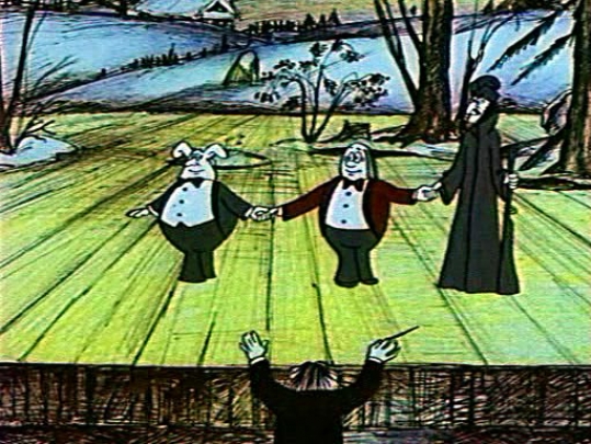 После этих слов – гремит фанфарами румынский оркестр, вывалившись из большого шкафа. (Почему румынский – в тексте либретто не поясняется).