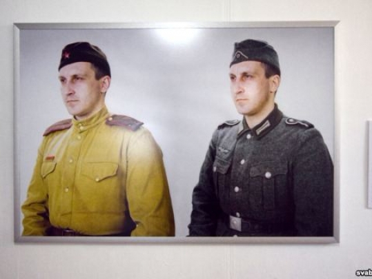 Гледачоў рэспублікі, якая, калі верыць прамовам афіцыйных асоб, амаль што адна, на ўласныя сілы, перамагла фашызм, абразіў падвойны партрэт удзельніка гістарычных рэканструкцыяў на тэму Другой сусьветнай вайны. У правай частцы фота герой апрануты ў савецкую ўніформу, у левай — у фашысцкі «фрэнч».