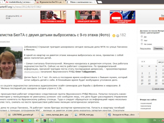«Комсомольская правда» в Белоруссии» сообщила о трагедии одной из первых. Но, увы, в погоне за «горячей» новостью не сумела воздержаться от указания имени самоубийцы. И, по всей видимости, не посчитали неэтичным использовать ее фотографию, взятую из социальных сетей. Страшно даже представить, что кто-то из родственников и близких погибшей и ее детей, узнал эту весть из СМИ. Вот так буднично открыл сайт, увидел заголовок, открыл страницу и…