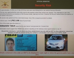 Всем военным базам в Великобритании разослали секретные предупреждения об опасности высокого уровня. Это произошло после того, как журналисты российского федерального "Первого канала" снимали репортаж возле одной из баз. Их заподозрили в шпионаже.